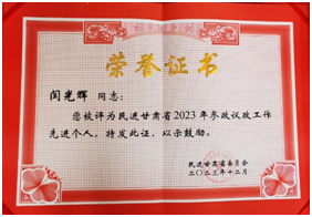 民进甘肃省第九届委员会2023年度参政议政年会对“民进甘肃省2023年参政议政工作先进集体”和“民进甘肃省2023年参政议政工作先进个人”进行了表彰,民进兰州交通大学委员会主委闫光辉教授荣获“民进甘肃省2023年参政议政工作先进个人”,并在会上做了“围绕区域发展战略,充分发挥专业特长,凸显参政议政成效”交流发言。