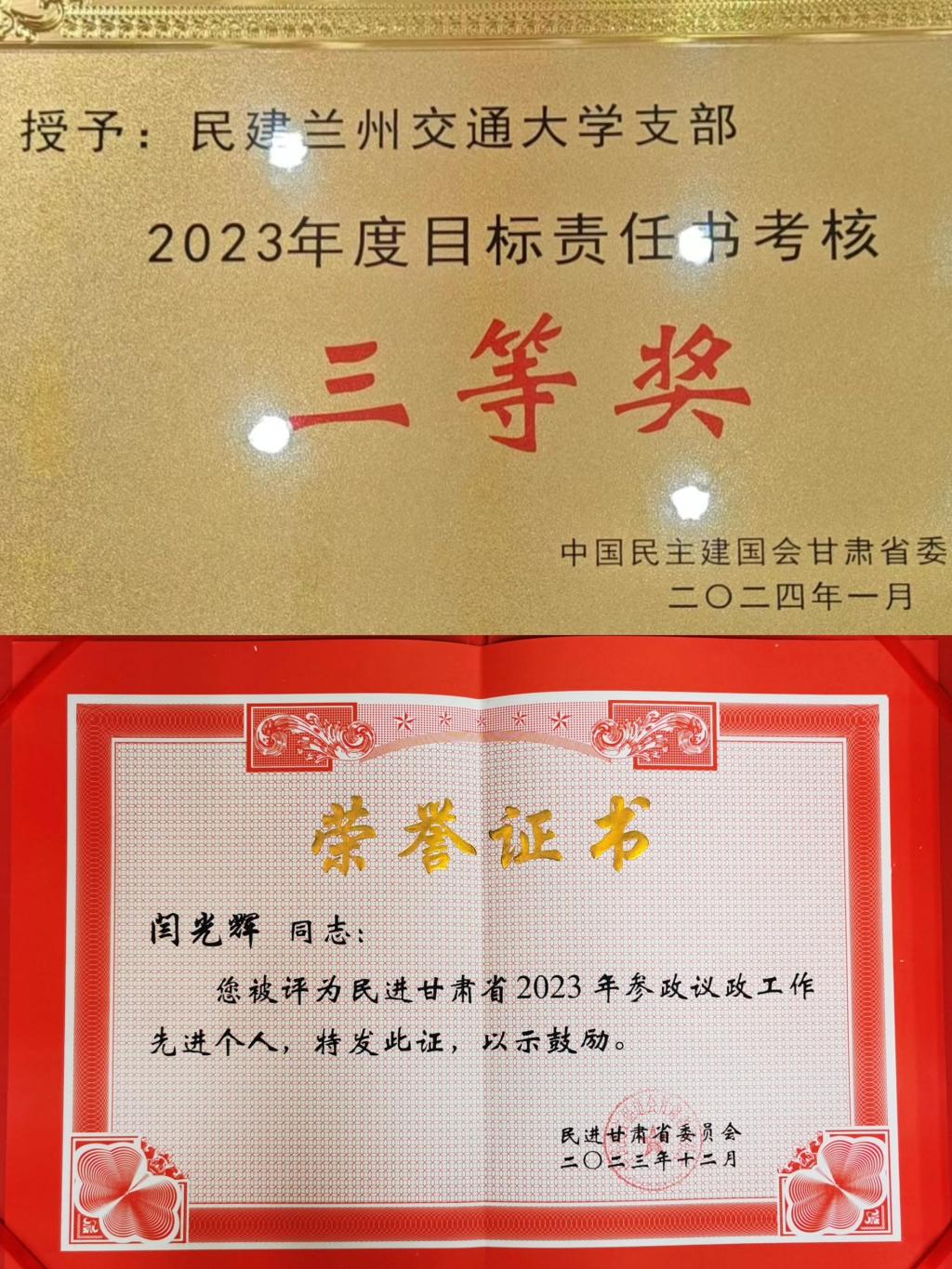 民盟兰州交通大学委员会盟员黄跃昊获评盟务工作先进个人;民建兰州交通大学支部获2023年度目标责任书考核三等奖,主委孟宪刚获民建甘肃省2023年参政议政先进个人;民进兰州交通大学委员会主委闫光辉获民进甘肃省2023年参政议政先进个人;九三学社兰州交通大学委员会主委董海鹰获九三学社甘肃省2023年参政议政先进个人;市人大代表、校侨联主席逯迈获评兰州市优秀人大代表,并被省人大办公厅确定为省委胡昌升书记联系的两名优秀基层人大代表之一。