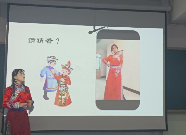 活动现场,来自不同民族的同学们身着各自民族的特色服饰依次上台,他们通过图文并茂的PPT展示,生动地介绍了各自民族的历史沿革、传统节日、饮食习惯、服饰特色以及民间艺术等丰富多彩的文化元素。藏族的同学介绍了他们服装的特点,蒙古族的同学用流利的普通话向大家介绍了蒙古族的游牧传统。他表示,蒙古族人民热爱生活,善于用双手创造美好的生活。而裕固族的同学则通过图片和视频展示了裕固族的独特魅力。每一个民族都有其独特的魅力和价值,这些丰富多彩的文化元素共同构成了中华民族文化的瑰宝。每一位分享者都充满激情,他们的话语中流露出对自己民族文化深深的自豪与热爱。观众们在聆听的同时,也积极提问,现场气氛热烈而融洽。