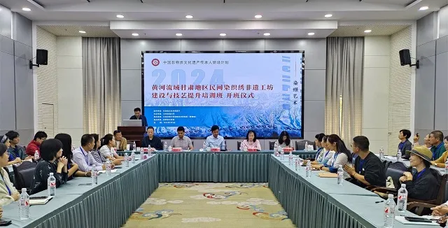 9月5日上午,中国非物质文化遗产传承人研培计划——黄河流域甘肃地区民间染织绣非遗工坊建设与技艺提升培训班在兰州交通大学举行开班仪式。甘肃省文化和旅游厅非物质文化遗产处,兰州交通大学研究院、社会服务与成果转化中心,庆阳市文旅局,庆阳市文化馆,临夏州文化馆相关负责人,以及来自全国十省(市)的40名学员参加了开班仪式,并参观“丝路缬长河——兰州交通大学染缬艺术创作精品展”。