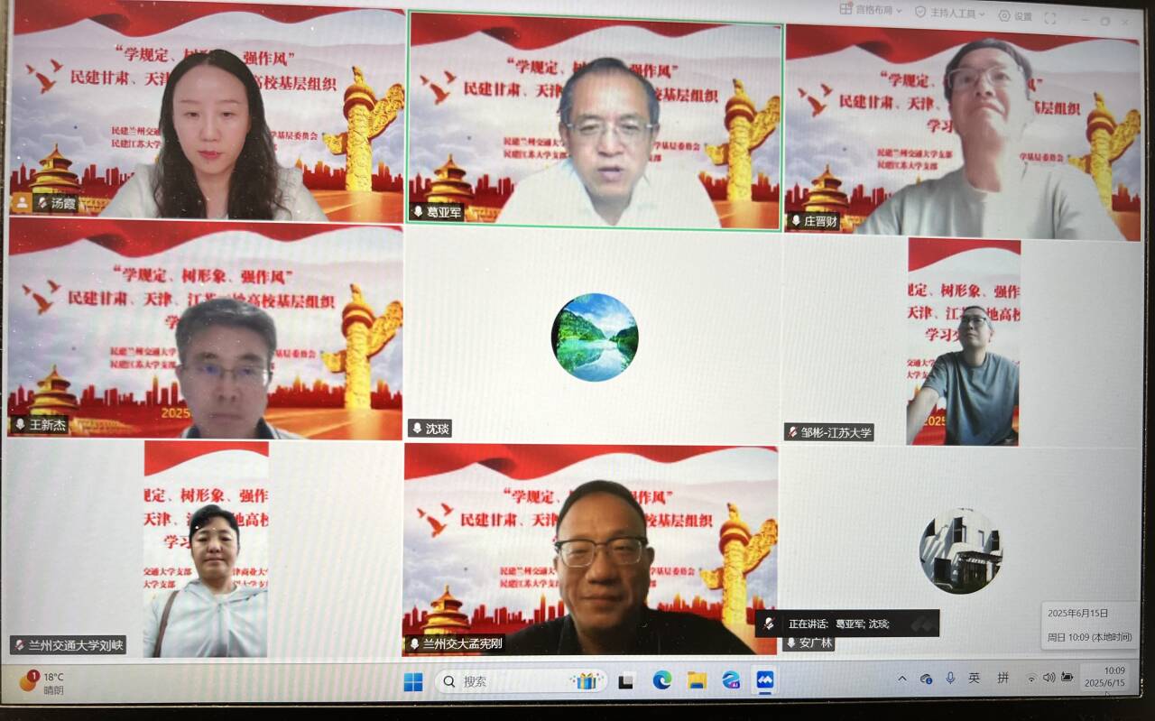 6月15日,民建兰州交通大学支部、民建天津商业大学基层委员会、民建江苏大学支部、民建常州大学支部“学规定、强作风、树形象”主题教育学习交流会以线上的形式召开。本次会议由民建兰州交通大学支部承办,民建兰州交通大学支部副主委汤霞主持,四所高校的民建基层组织全体会员参加。