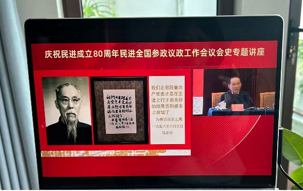 朱一多同志从四个历史时期全面回顾了民进成立80年来的光辉历程、伟大贡献和宝贵经验,深刻阐释了“立会为公、参政为民”的民进优良传统,以详实丰富的图片与文字资料分享了民进履行参政党职能的重要工作与成果,最后以蔡达峰主委提出的“学习民进光荣历史和履职经验,汲取奋进力量,更好发挥作用”与大家共勉。